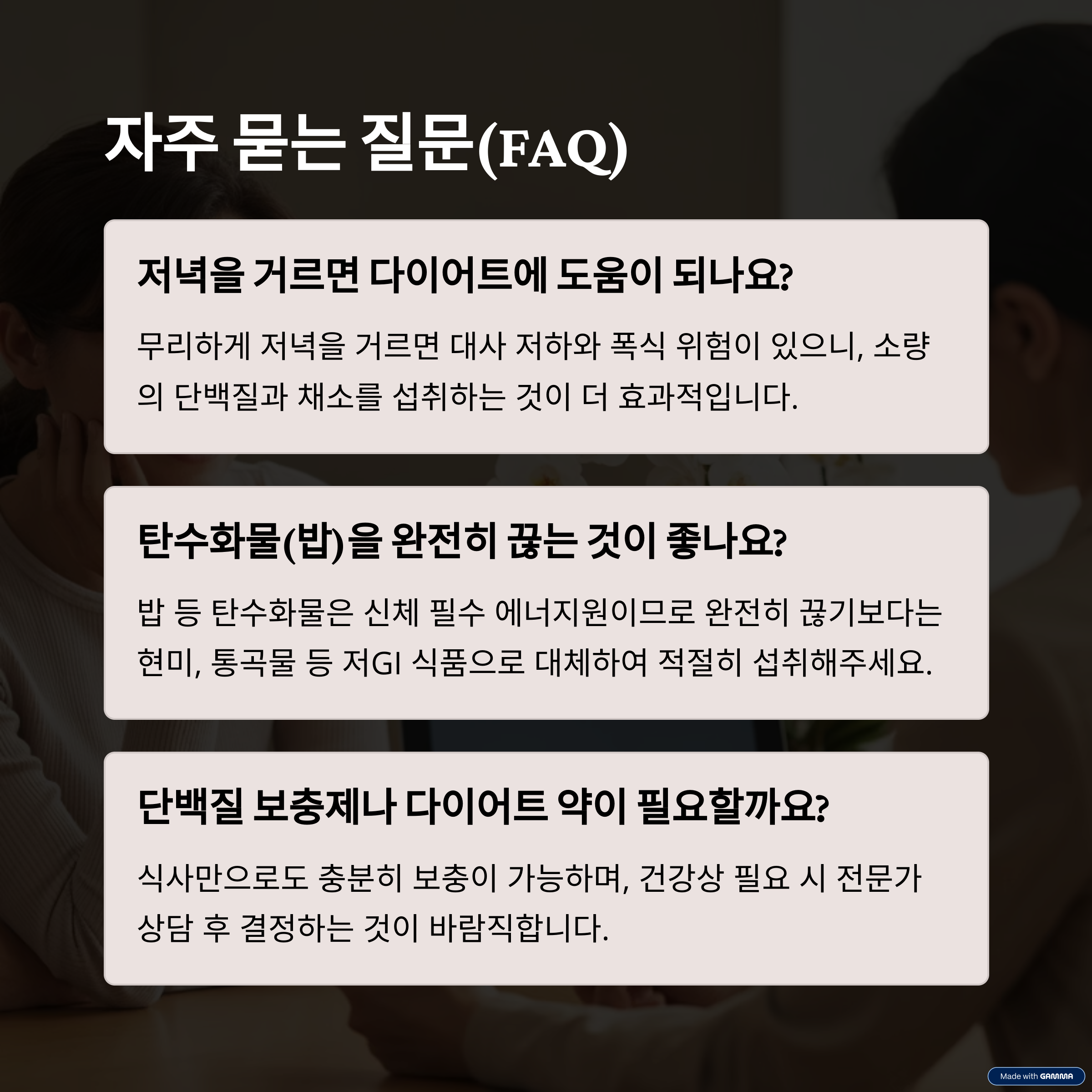 - A. 무리하게 저녁을 거르면 대사 저하와 폭식 위험이 있으니, 소량의 단백질과 채소를 섭취하는 것이 더 효과적입니다.