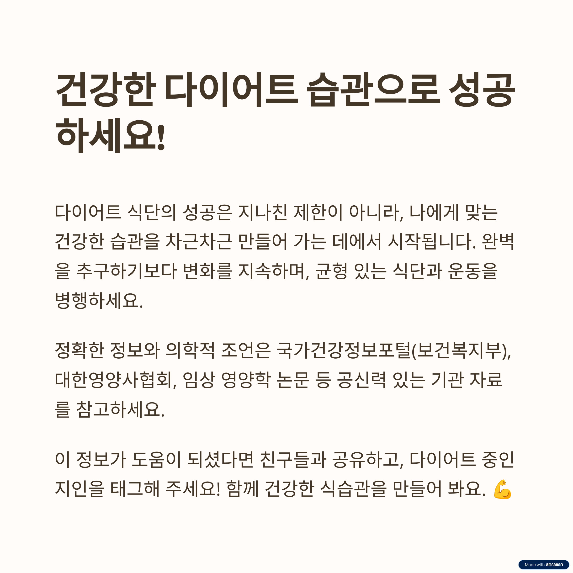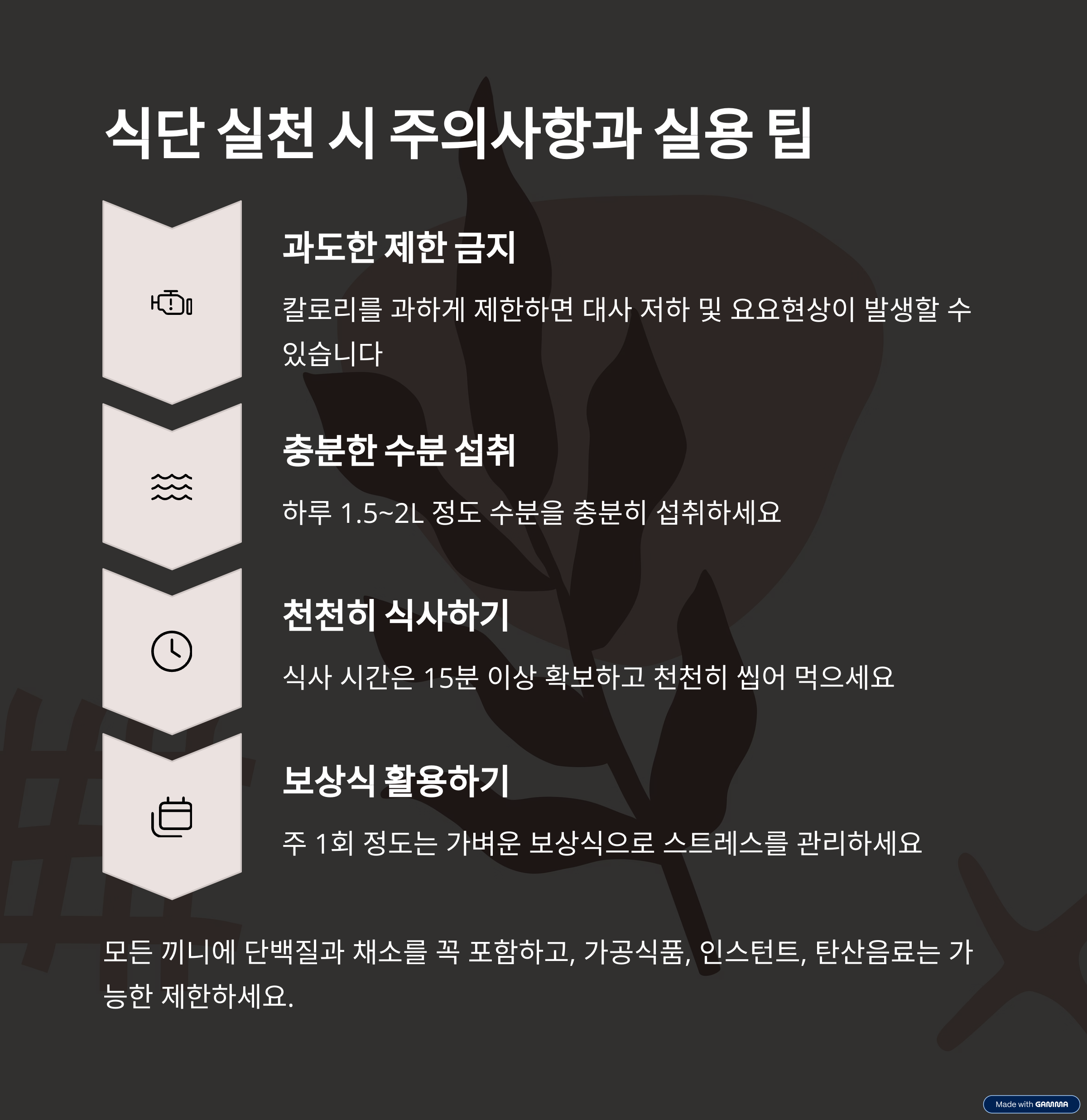 - 칼로리를 과하게 제한하면 대사 저하 및 요요현상이 발생할 수 있으니 주의